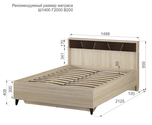 Кровать со спальным местом 140х200 см:Ширина: 1488 ммВысота: 950 ммГлубина: 2125 мм